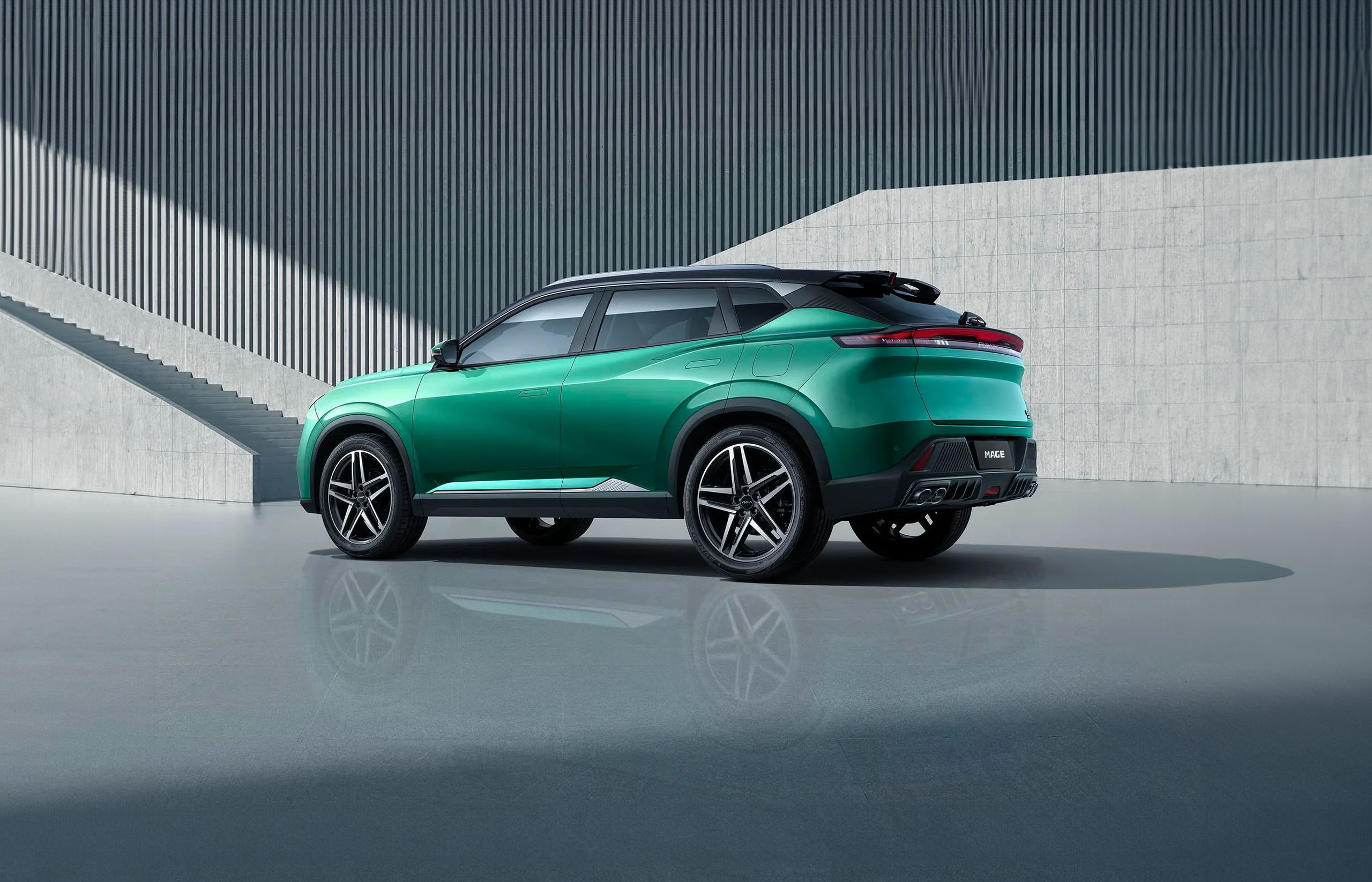 Mage выполнен в современном стиле High Tech, имеет острый «акулий» выступ капота, высокую поясную линию и сложное формообразование боковин. Полностью светодиодная оптика Full LED образует сплошные световые полосы спереди и сзади, а вертикальные дополнительные стоп-сигналы, развитый задний спойлер Star Speed и выхлопная система спортивного типа с четырьмя патрубками намекают на спортивную ДНК модели. Откидные внешние ручки дверей дополняют образ кроссовера нового поколения.