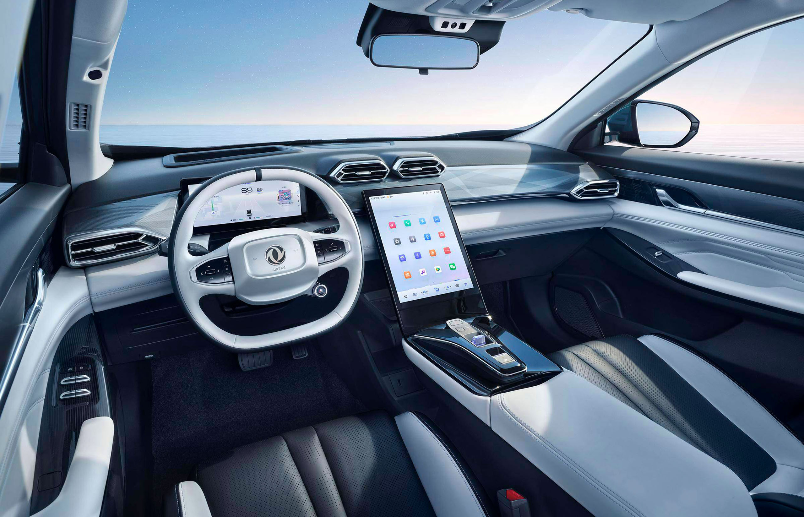 При создании интерьера Dongfeng Mage использовались премиальные отделочные материалы. Сиденья отделаны перфорированной экокожей, а оригинальный переключатель режимов АКП выполнен в виде драгоценного камня, прошедшего огранку. На выбор предложены два вида салона с белой прострочкой – с черной обивкой либо вариант со светлыми вставками.